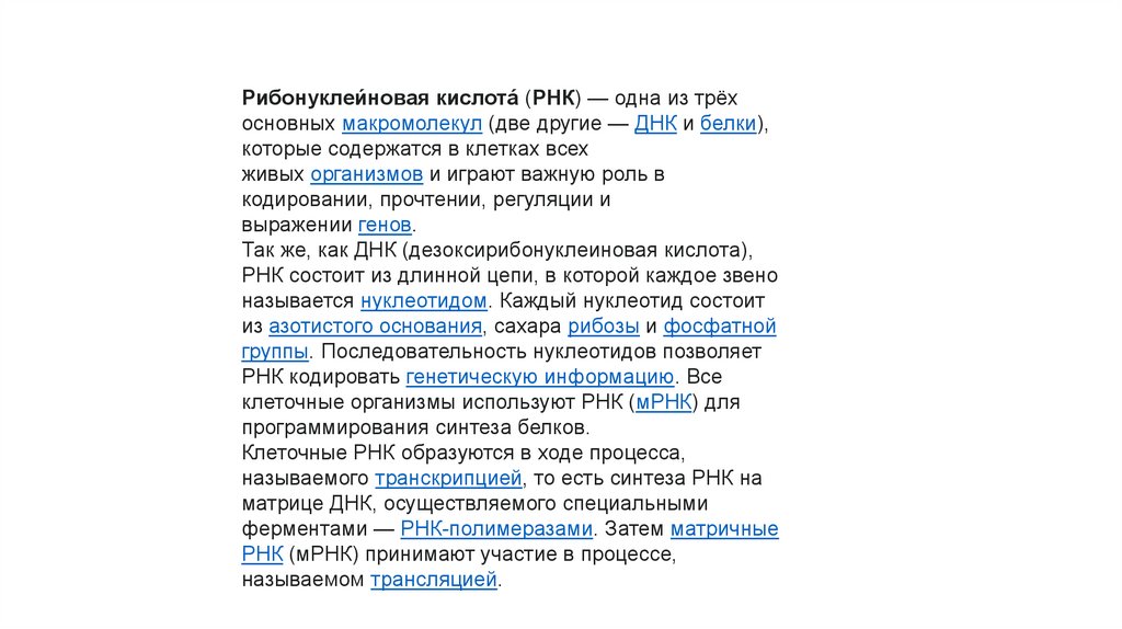 Рибонуклеи́новая кислота́ (РНК) — одна из трёхосновных макромолекул (две другие — ДНК и белки),
