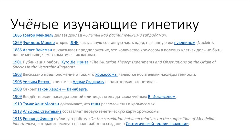Учёные изучающие гинетику1865 Грегор Мендель делает доклад «Опыты над растительными гибридами».