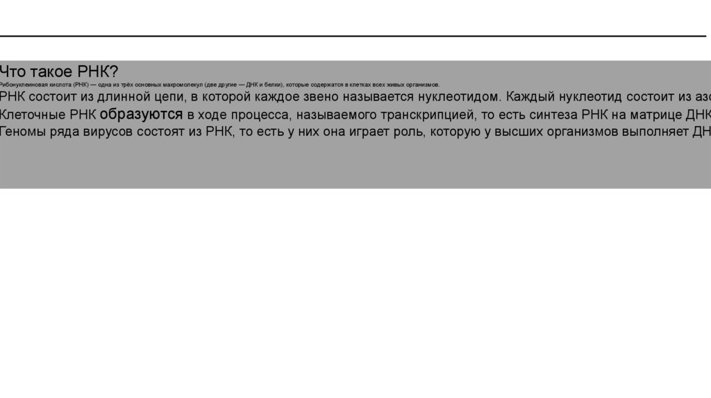 Что такое РНК?Рибонуклеиновая кислота (РНК) — одна из трёх основных макромолекул (две другие — ДНК и белки), которые содержатся в клетках всех живых организмов.