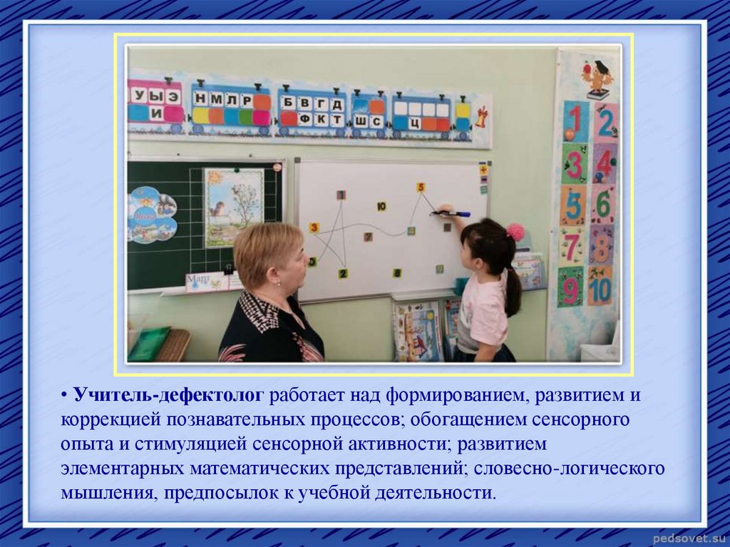• Учитель-дефектолог работает над формированием, развитием икоррекцией познавательных процессов; обогащением сенсорного