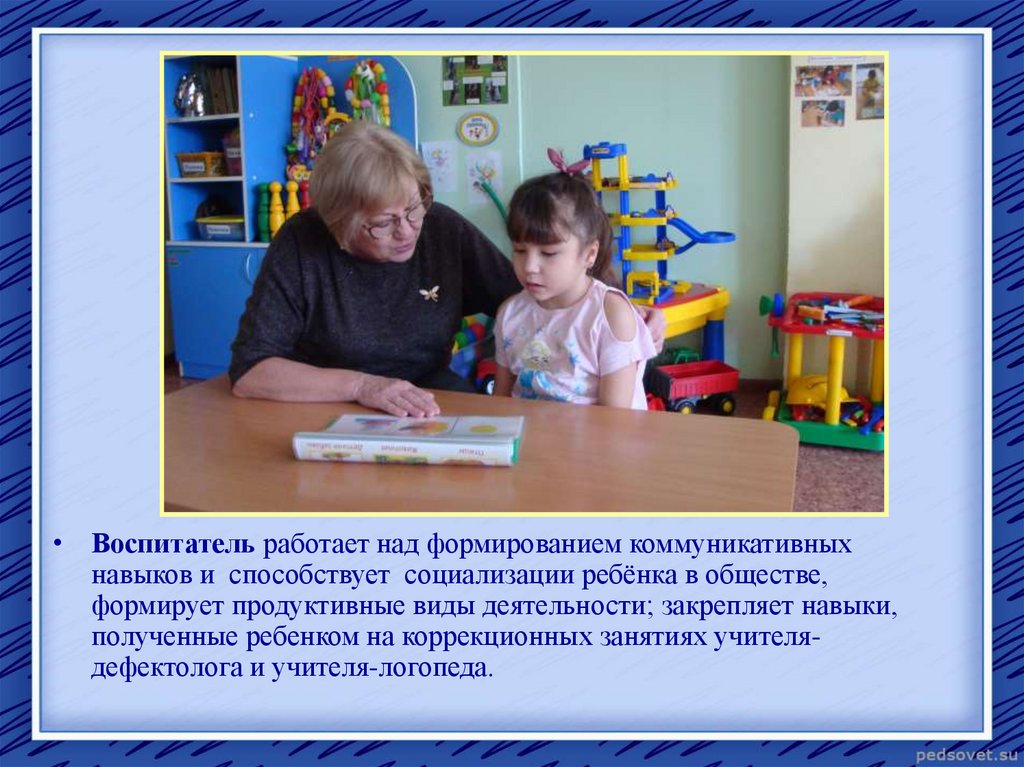 • Воспитатель работает над формированием коммуникативныхнавыков и способствует социализации ребёнка в обществе,