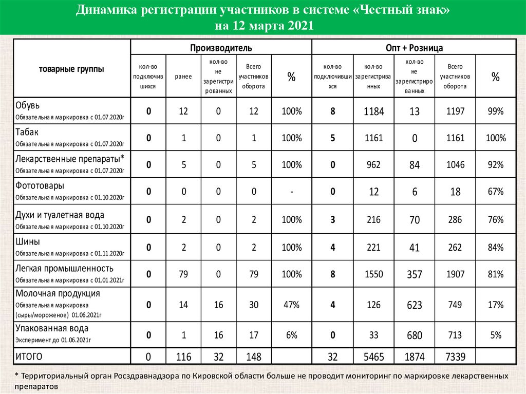 Динамика регистрации участников в системе «Честный знак»на 12 марта 2021