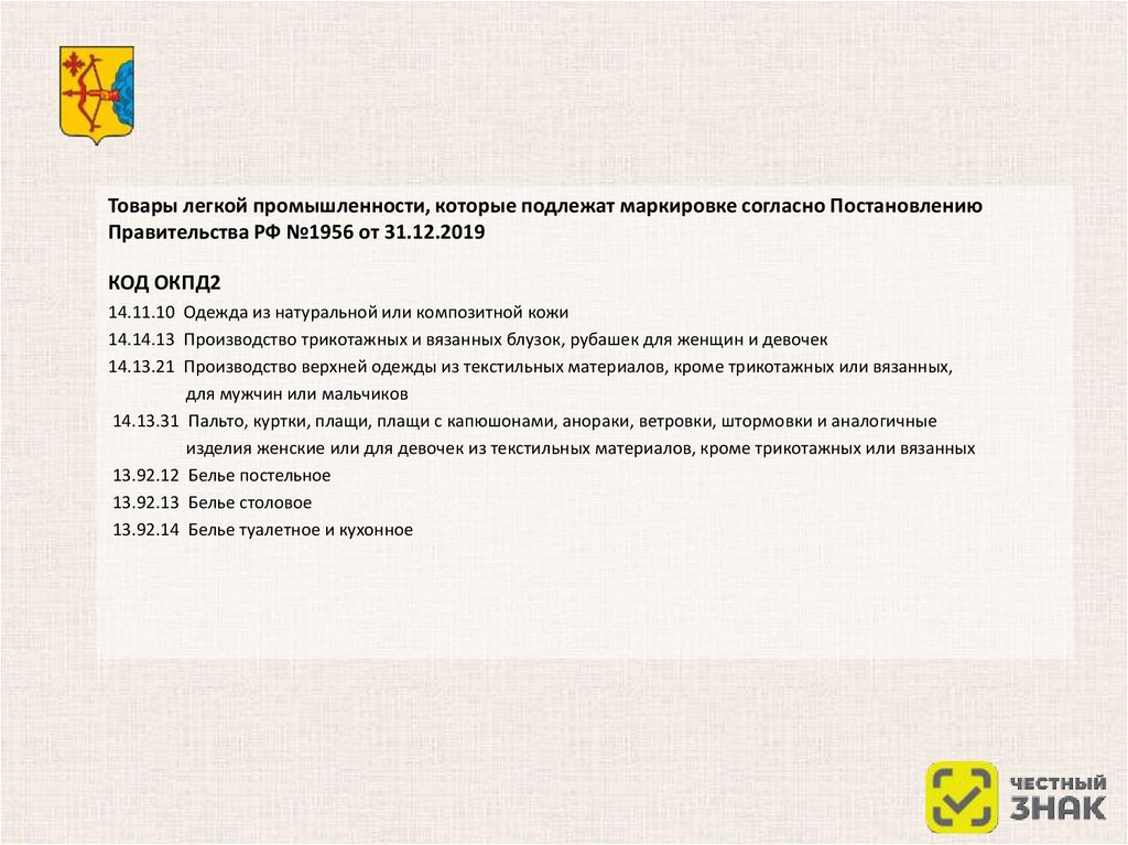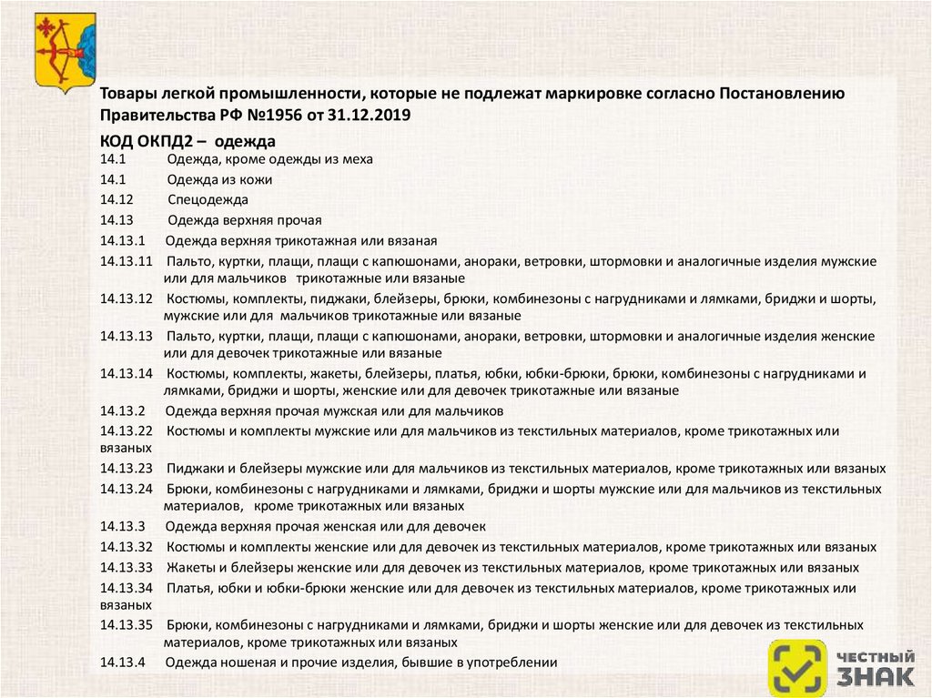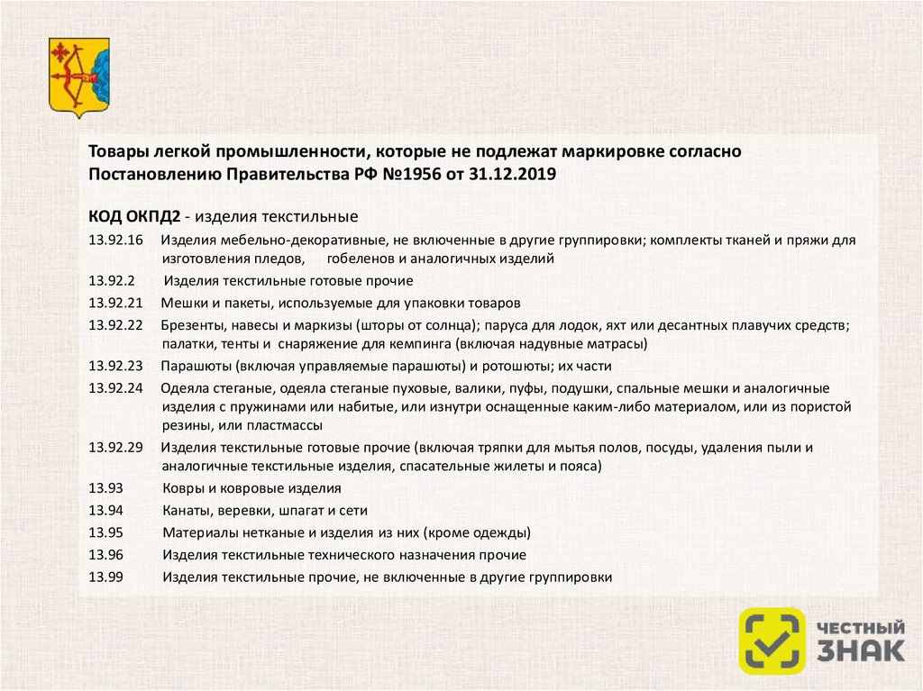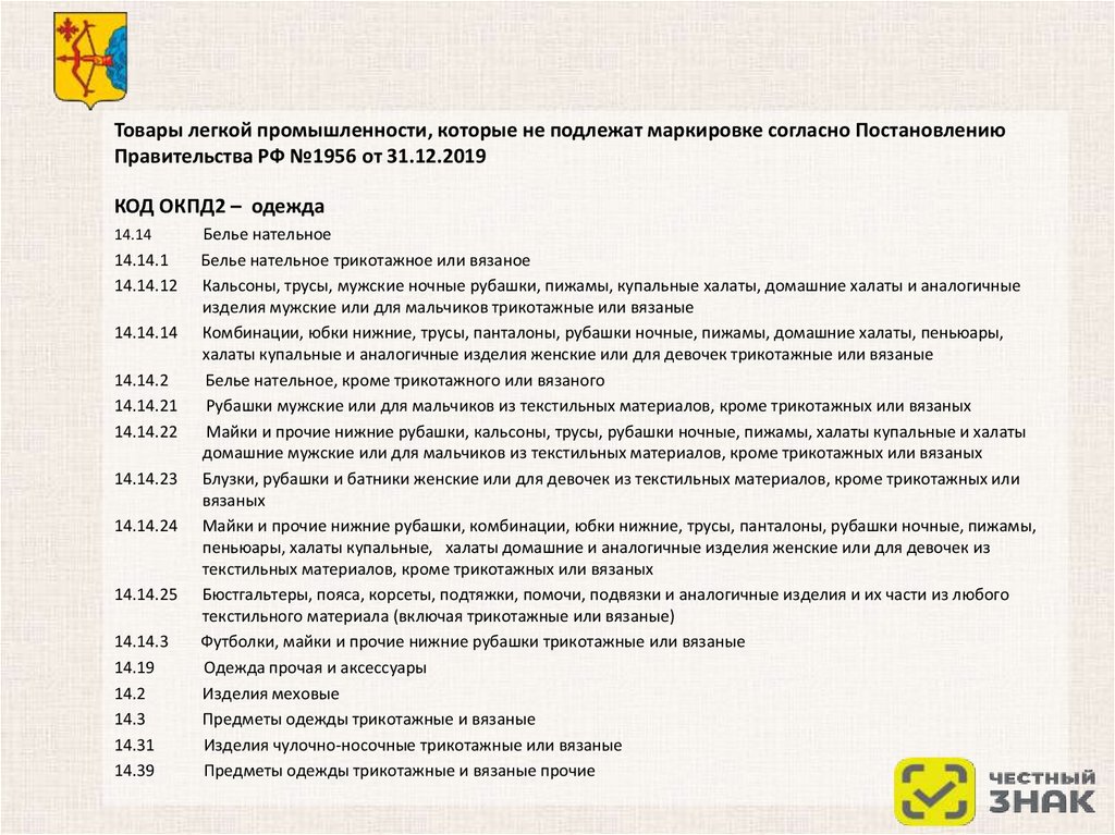Товары легкой промышленности, которые не подлежат маркировке согласно ПостановлениюПравительства РФ №1956 от 31.12.2019
