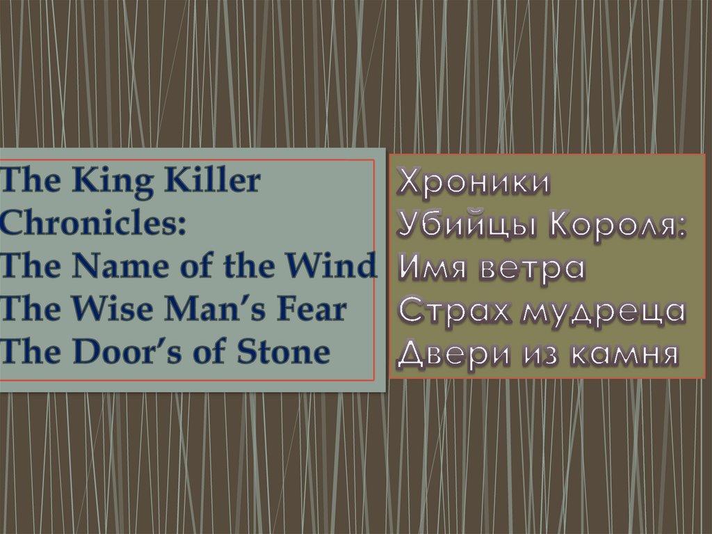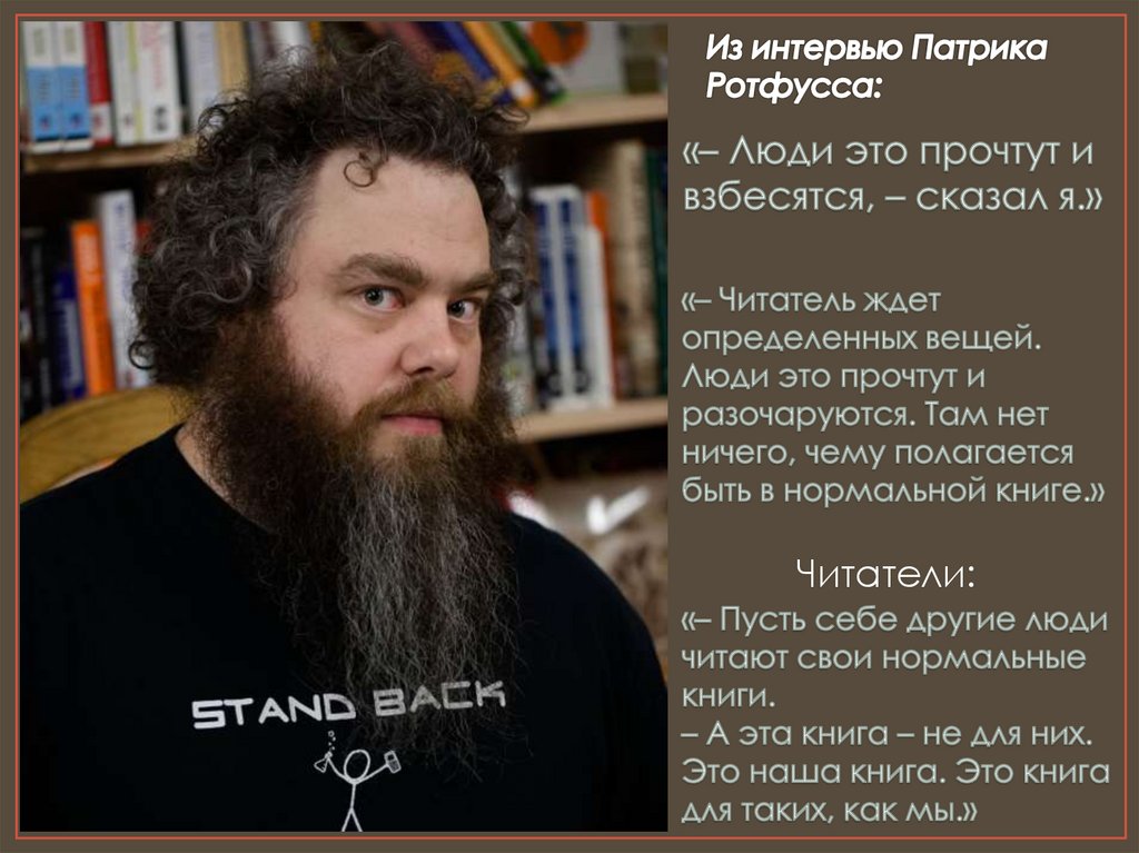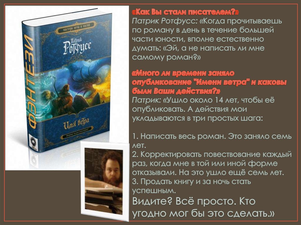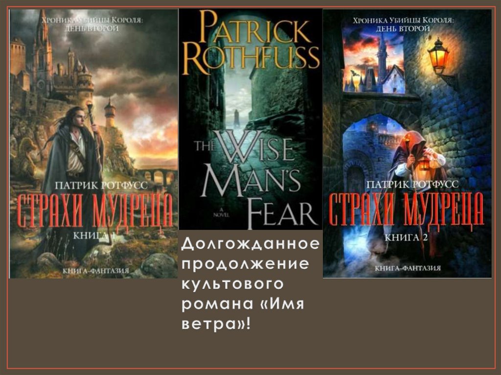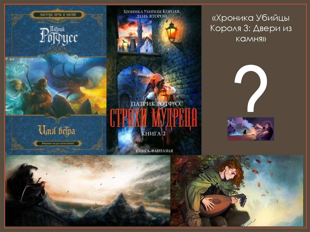 Патрик Ротфусс (англ. Patrick Rothfuss). «Имя ветра», «Хроника Убийцы Короля»