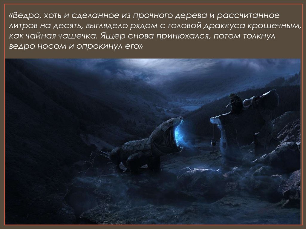 «Ведро, хоть и сделанное из прочного дерева и рассчитанноелитров на десять, выглядело рядом с головой драккуса крошечным,