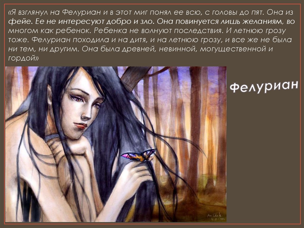 «Я взглянул на Фелуриан и в этот миг понял ее всю, с головы до пят. Она изфейе. Ее не интересуют добро и зло. Она повинуется лишь желаниям, во