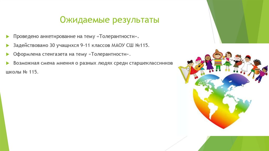 Ожидаемые результатыПроведено анкетирование на тему «Толерантности».