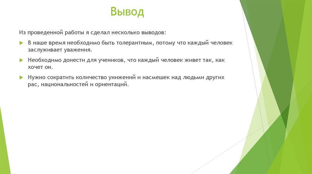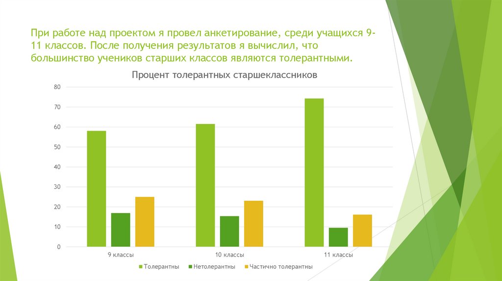 При работе над проектом я провел анкетирование, среди учащихся 911 классов. После получения результатов я вычислил, чтобольшинство учеников старших классов являются толерантными.