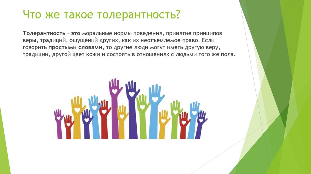 Что же такое толерантность?Толерантность – это моральные нормы поведения, принятие принципов