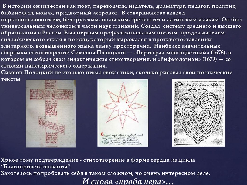 Симеон Полоцкий не столько писал свои стихи, сколько рисовал свои поэтические