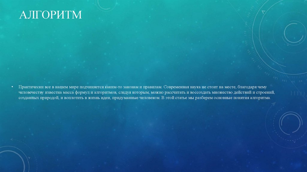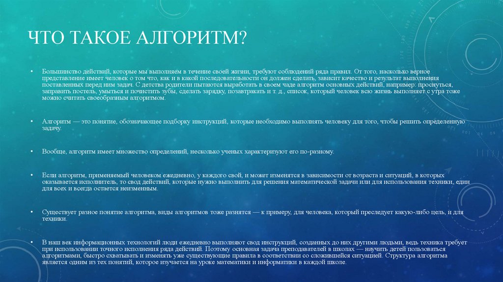 АЛГОРИТМПрактически все в нашем мире подчиняется каким-то законам и правилам. Современная наука не стоит на месте, благодаря чему