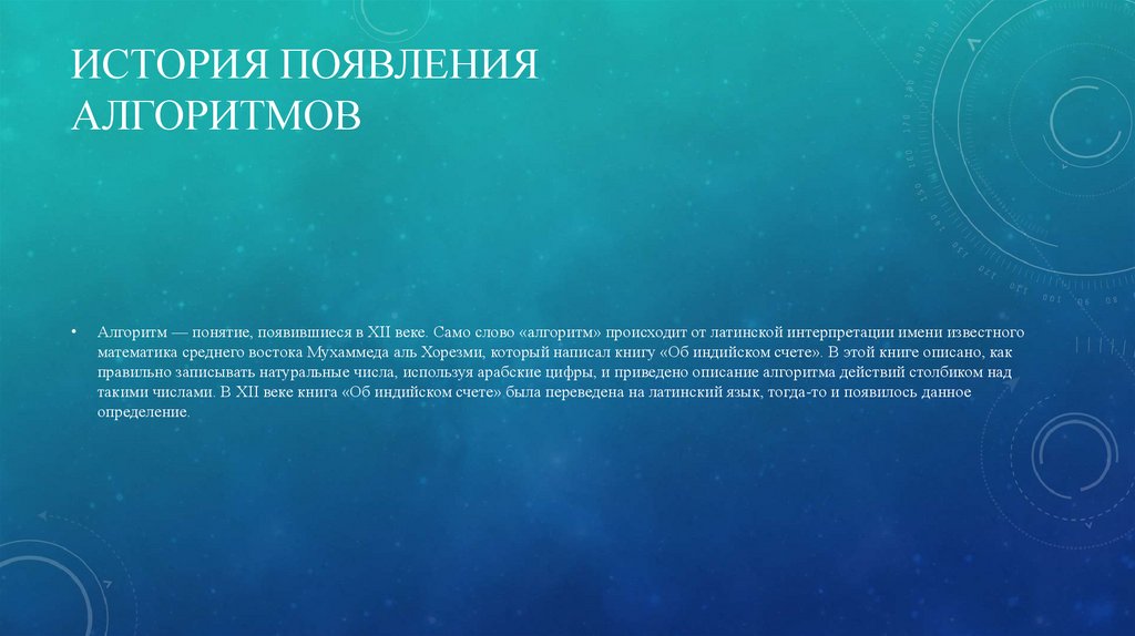 Алгоритм — понятие, появившиеся в XII веке. Само слово «алгоритм» происходит от латинской интерпретации имени известного