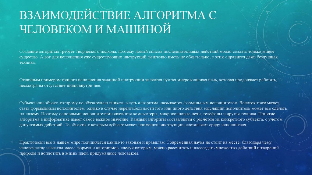 Субъект или объект, которому не обязательно вникать в суть алгоритма, называется формальным исполнителем. Человек тоже может