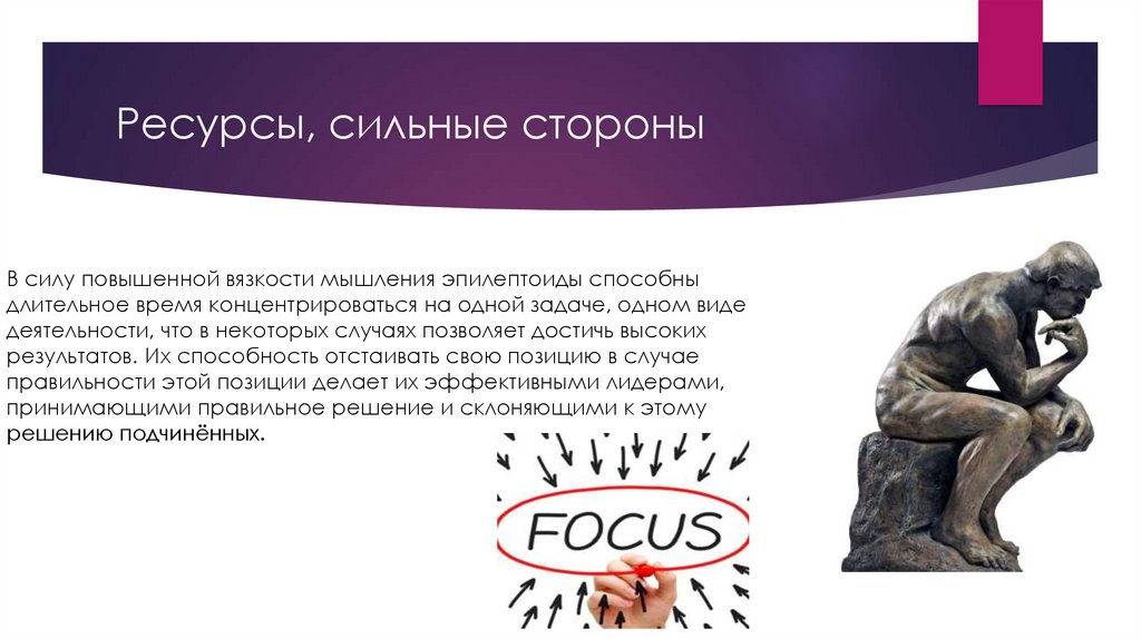 Ресурсы, сильные стороныВ силу повышенной вязкости мышления эпилептоиды способны