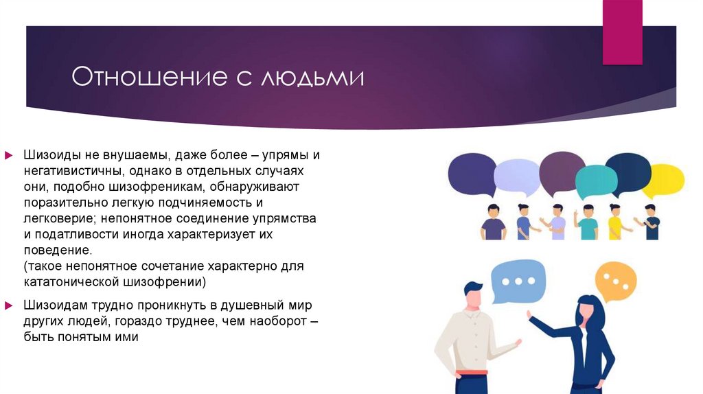 Отношение с людьмиШизоиды не внушаемы, даже более – упрямы и