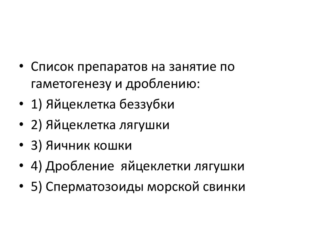 • Список препаратов на занятие погаметогенезу и дроблению: