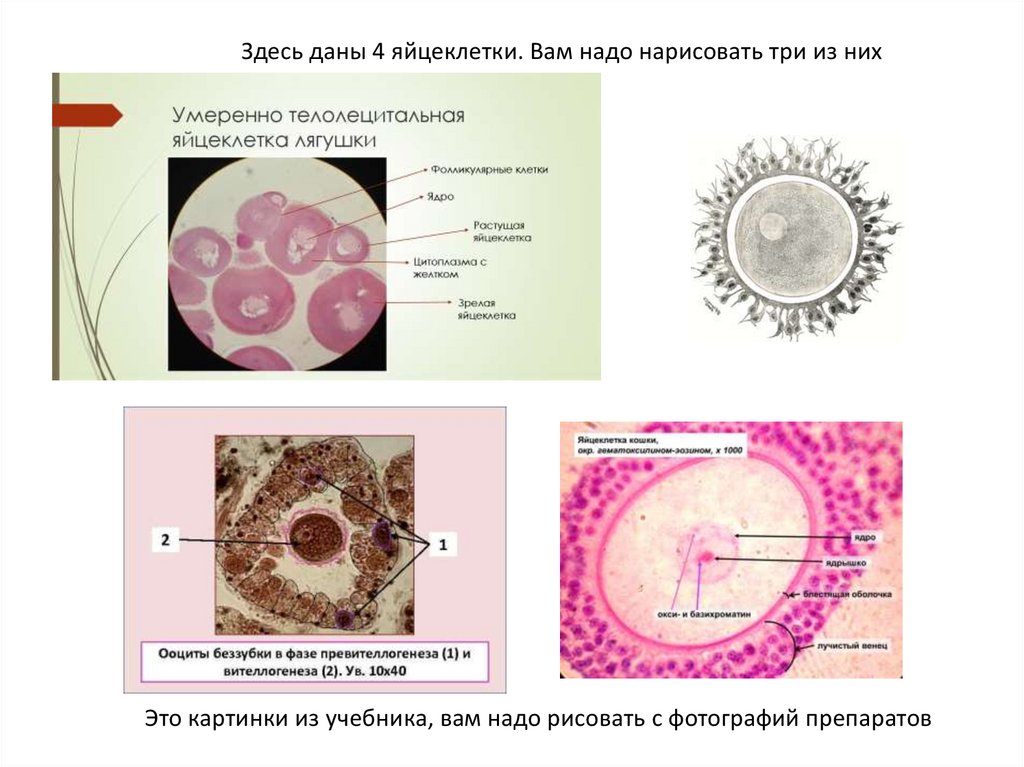 Здесь даны 4 яйцеклетки. Вам надо нарисовать три из нихЭто картинки из учебника, вам надо рисовать с фотографий препаратов