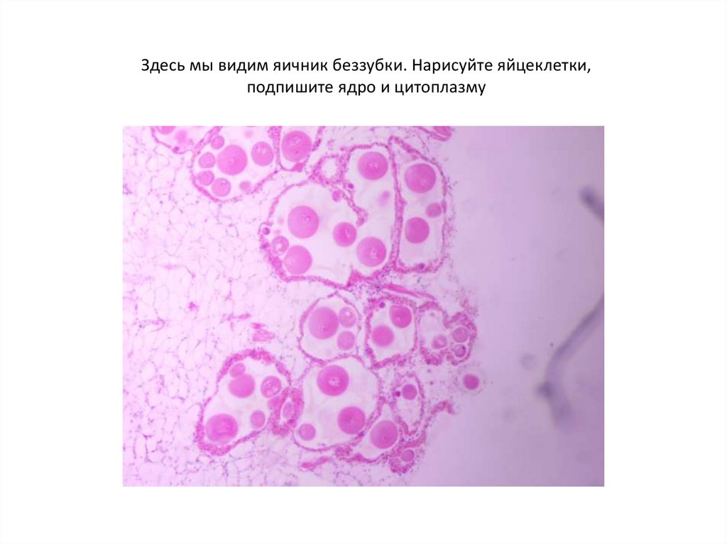 Здесь мы видим яичник беззубки. Нарисуйте яйцеклетки,подпишите ядро и цитоплазму
