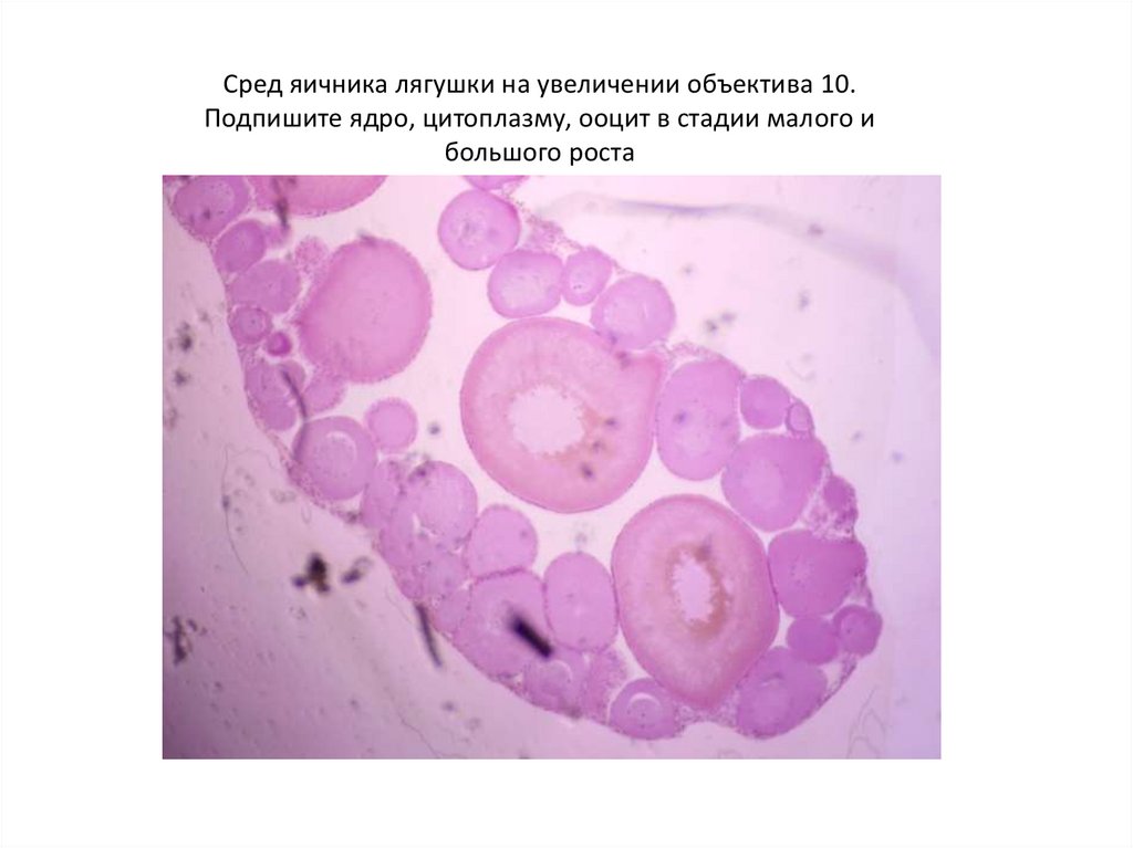 Сред яичника лягушки на увеличении объектива 10.Подпишите ядро, цитоплазму, ооцит в стадии малого и