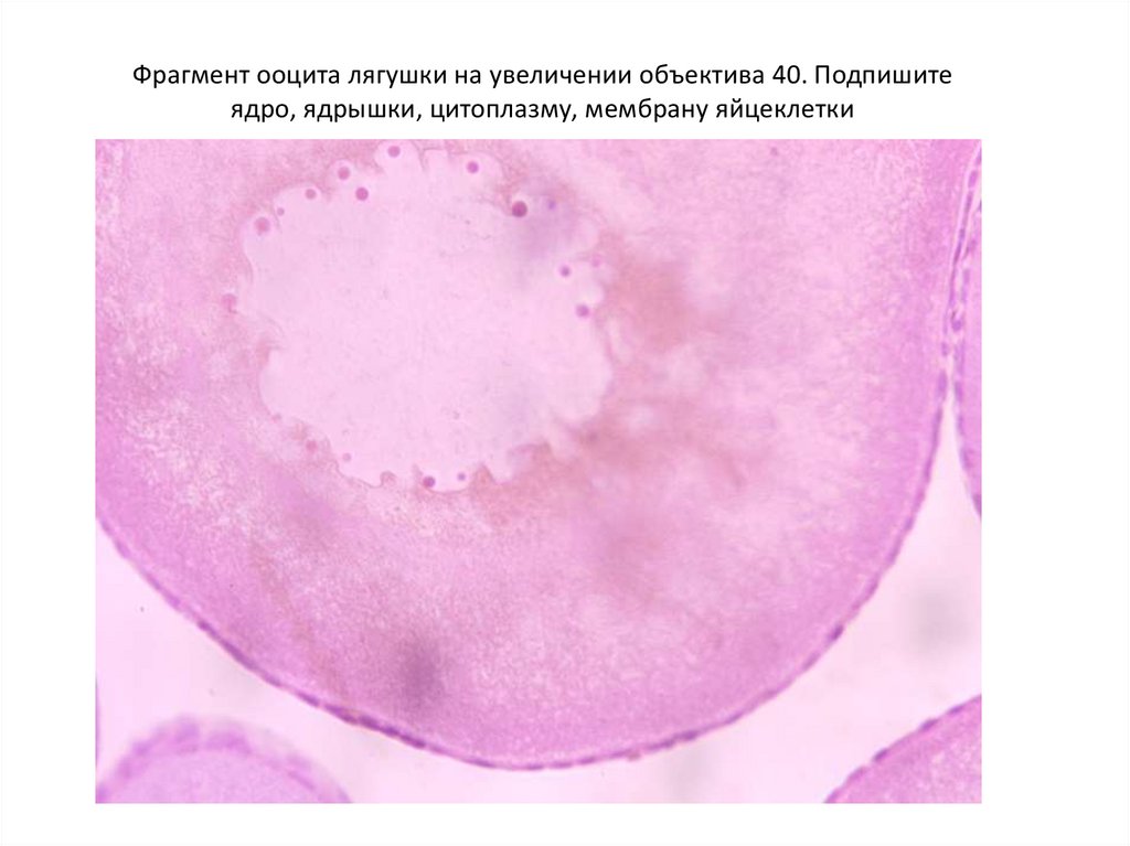 Фрагмент ооцита лягушки на увеличении объектива 40. Подпишитеядро, ядрышки, цитоплазму, мембрану яйцеклетки