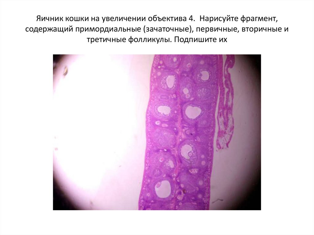 Яичник кошки на увеличении объектива 4. Нарисуйте фрагмент,содержащий примордиальные (зачаточные), первичные, вторичные и