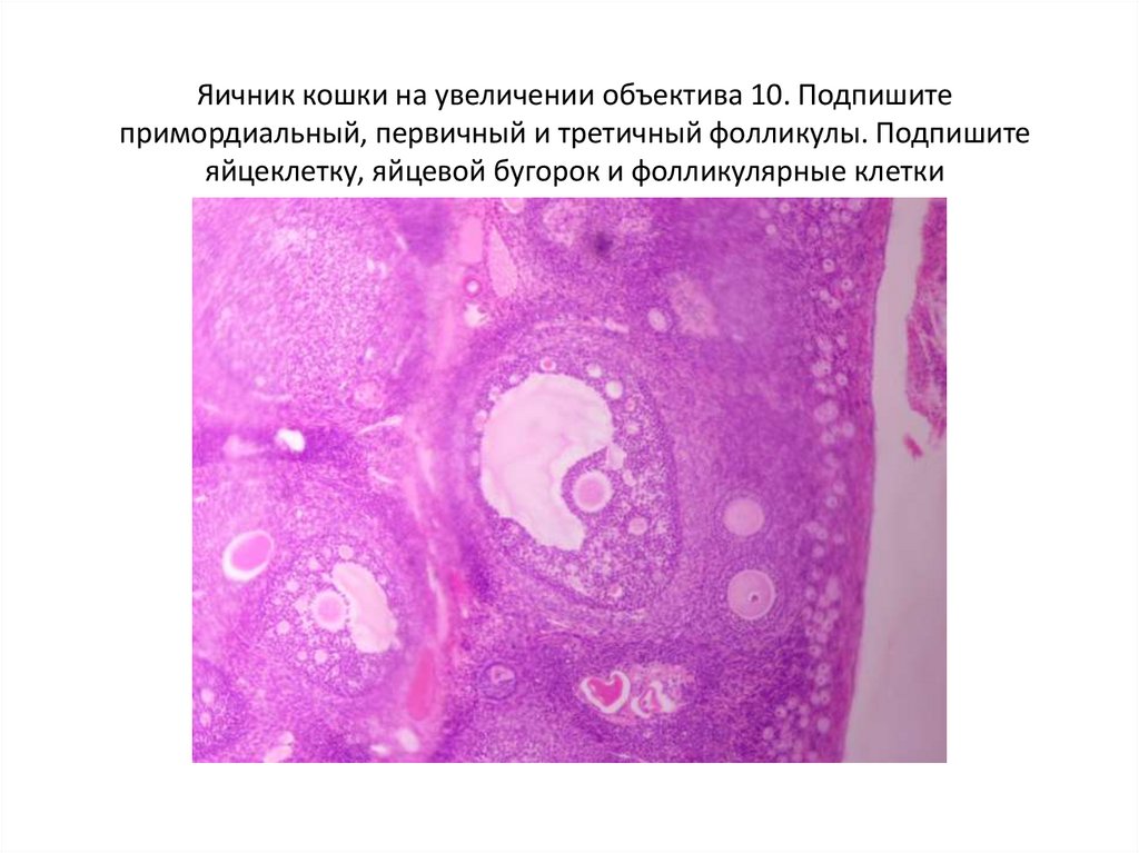 Яичник кошки на увеличении объектива 10. Подпишитепримордиальный, первичный и третичный фолликулы. Подпишите