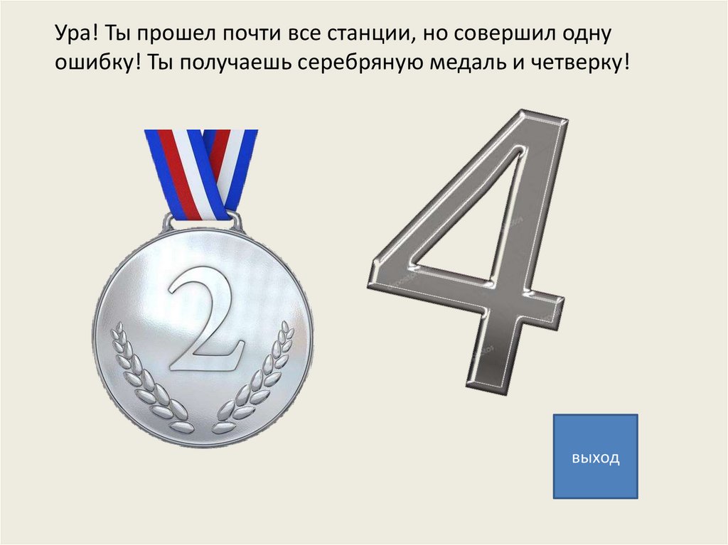 Ура! Ты прошел почти все станции, но совершил однуошибку! Ты получаешь серебряную медаль и четверку!