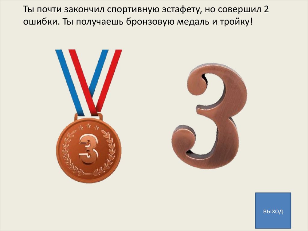 Ты почти закончил спортивную эстафету, но совершил 2ошибки. Ты получаешь бронзовую медаль и тройку!