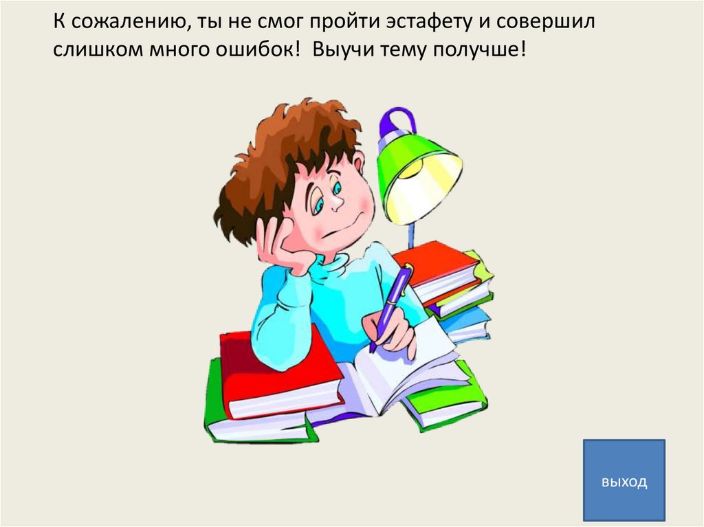 К сожалению, ты не смог пройти эстафету и совершилслишком много ошибок! Выучи тему получше!