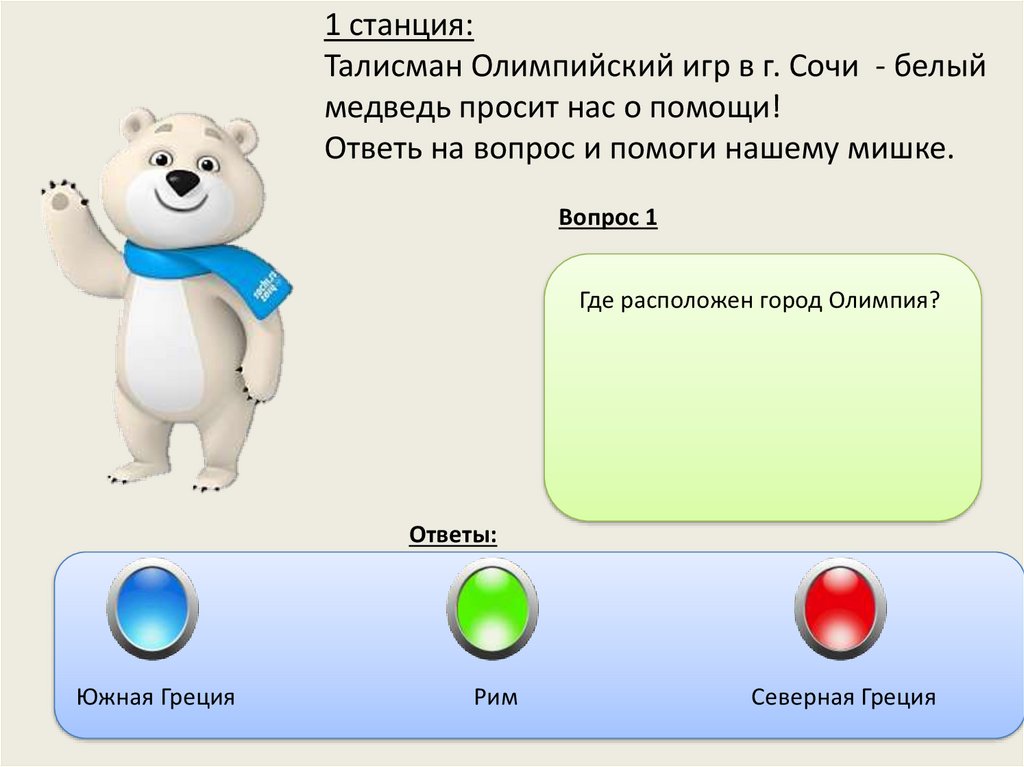 1 станция:Талисман Олимпийский игр в г. Сочи - белый