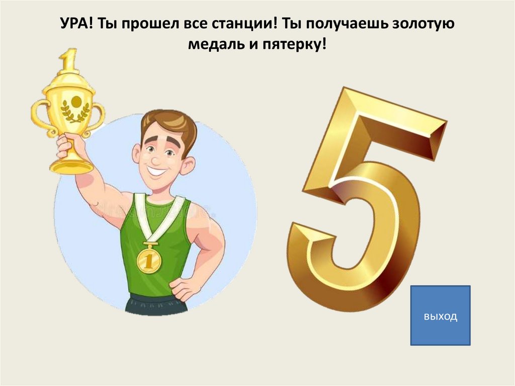УРА! Ты прошел все станции! Ты получаешь золотуюмедаль и пятерку!