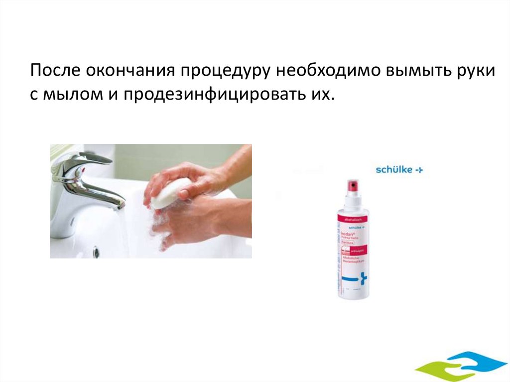 После окончания процедуру необходимо вымыть рукис мылом и продезинфицировать их.