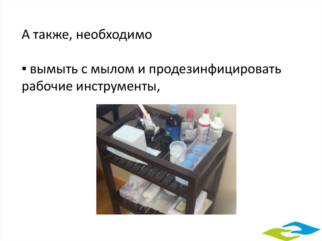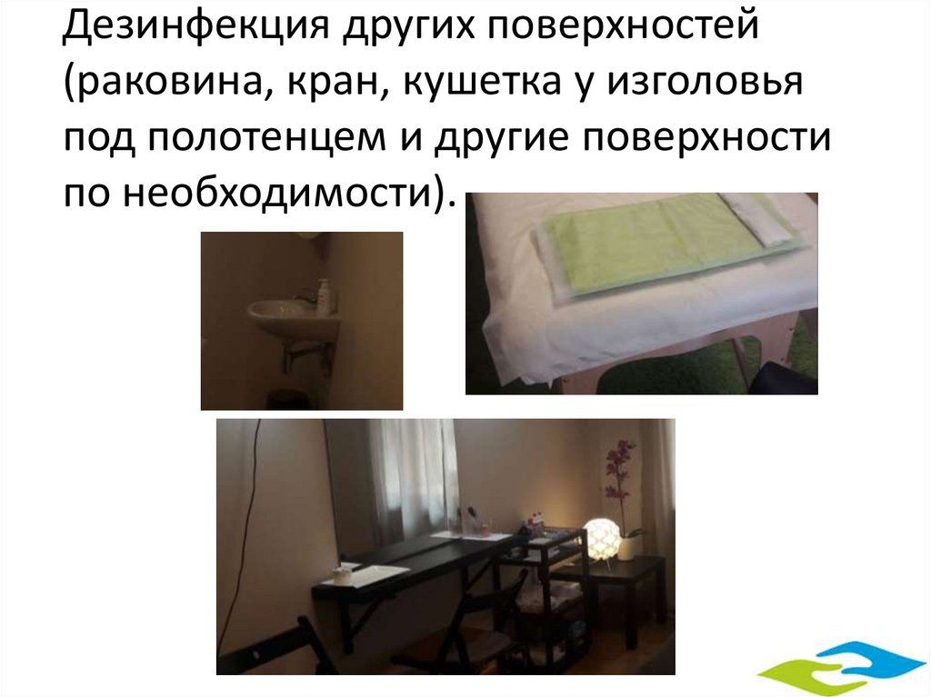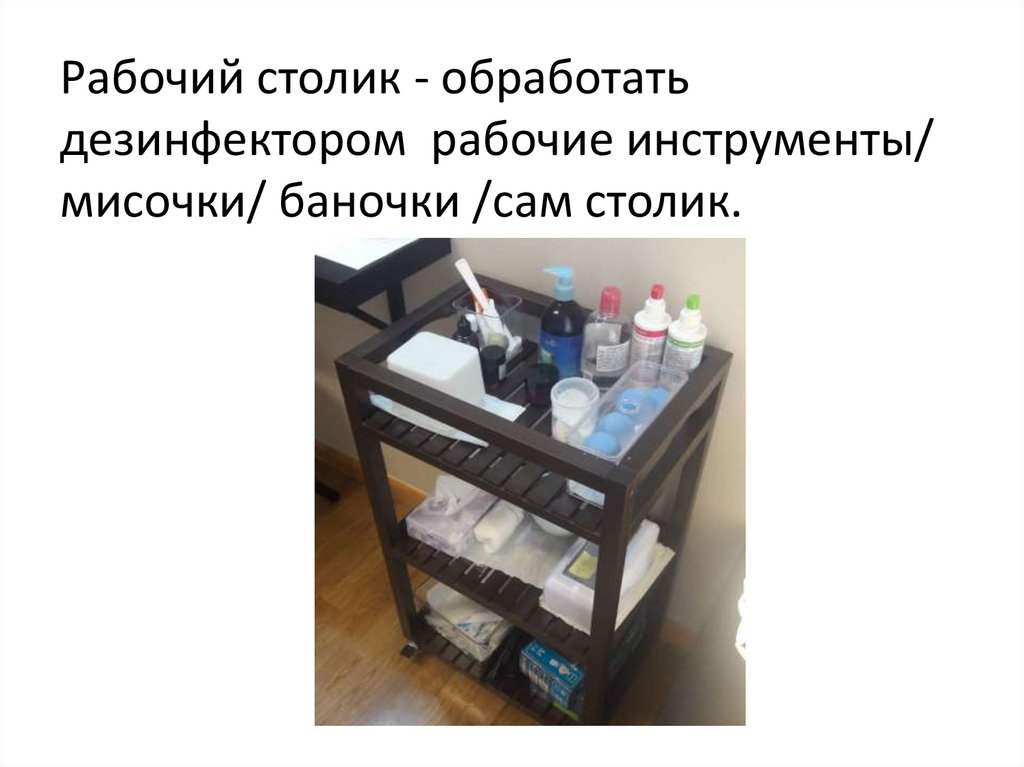 ▪ продезинфицировать рабочую поверхность,рабочий стул, раковину, кран и другие