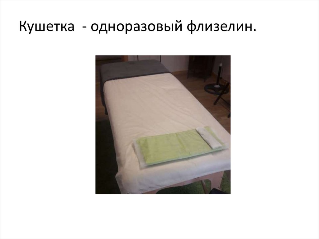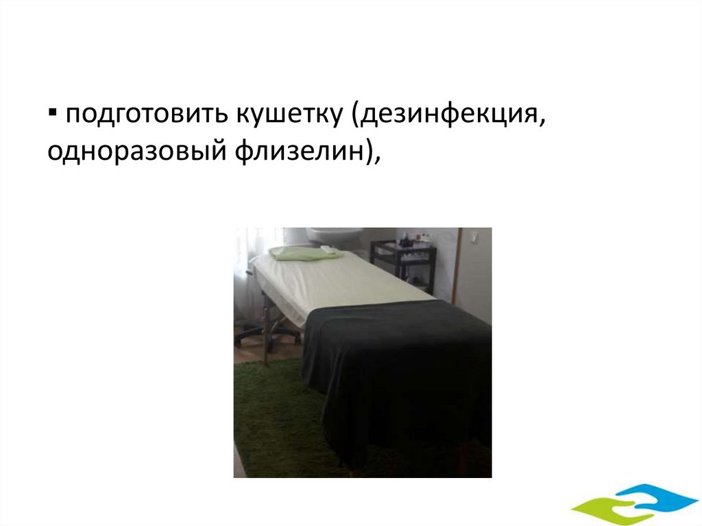 ▪ подготовить кушетку (дезинфекция,одноразовый флизелин),