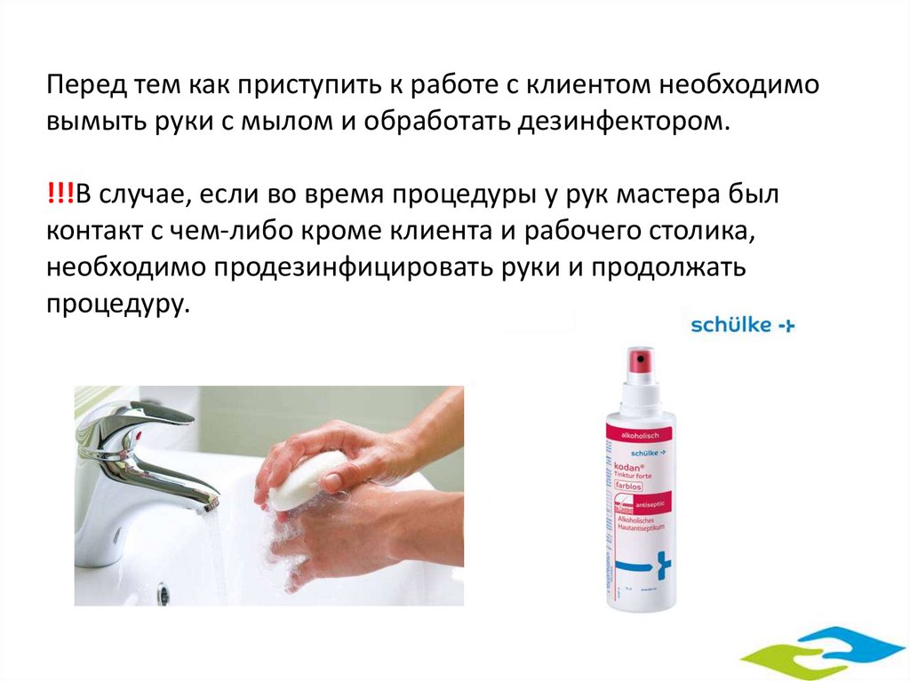 Перед тем как приступить к работе с клиентом необходимовымыть руки с мылом и обработать дезинфектором.