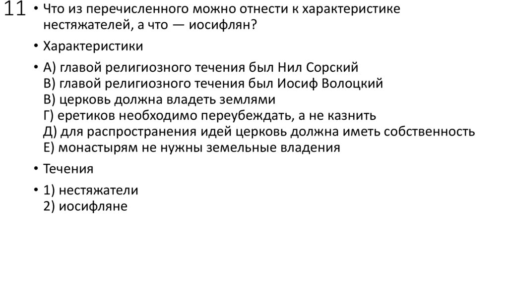 11 • Что из перечисленного можно отнести к характеристикенестяжателей, а что — иосифлян?
