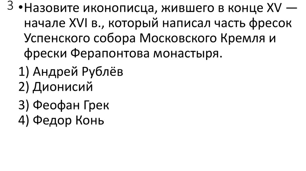 3 •Назовите иконописца, жившего в конце XV —начале XVI в., который написал часть фресок
