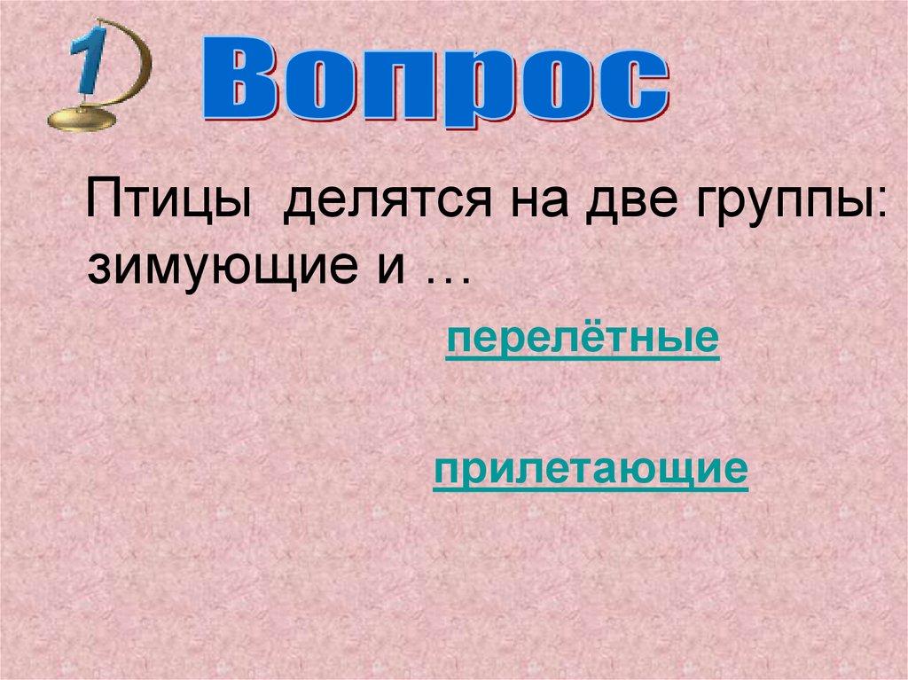 Птицы делятся на две группы:зимующие и …