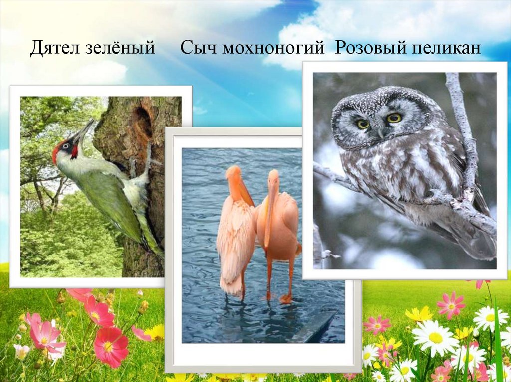 Дятел зелёныйСыч мохноногий Розовый пеликан