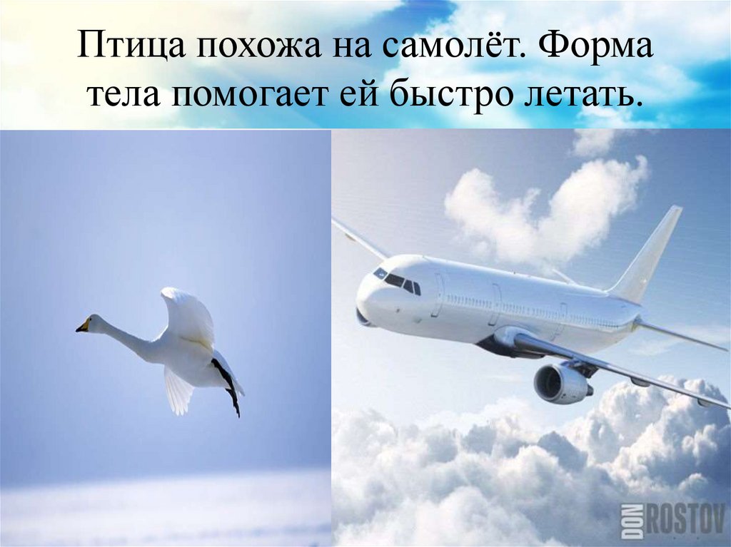 Птица похожа на самолёт. Форматела помогает ей быстро летать.