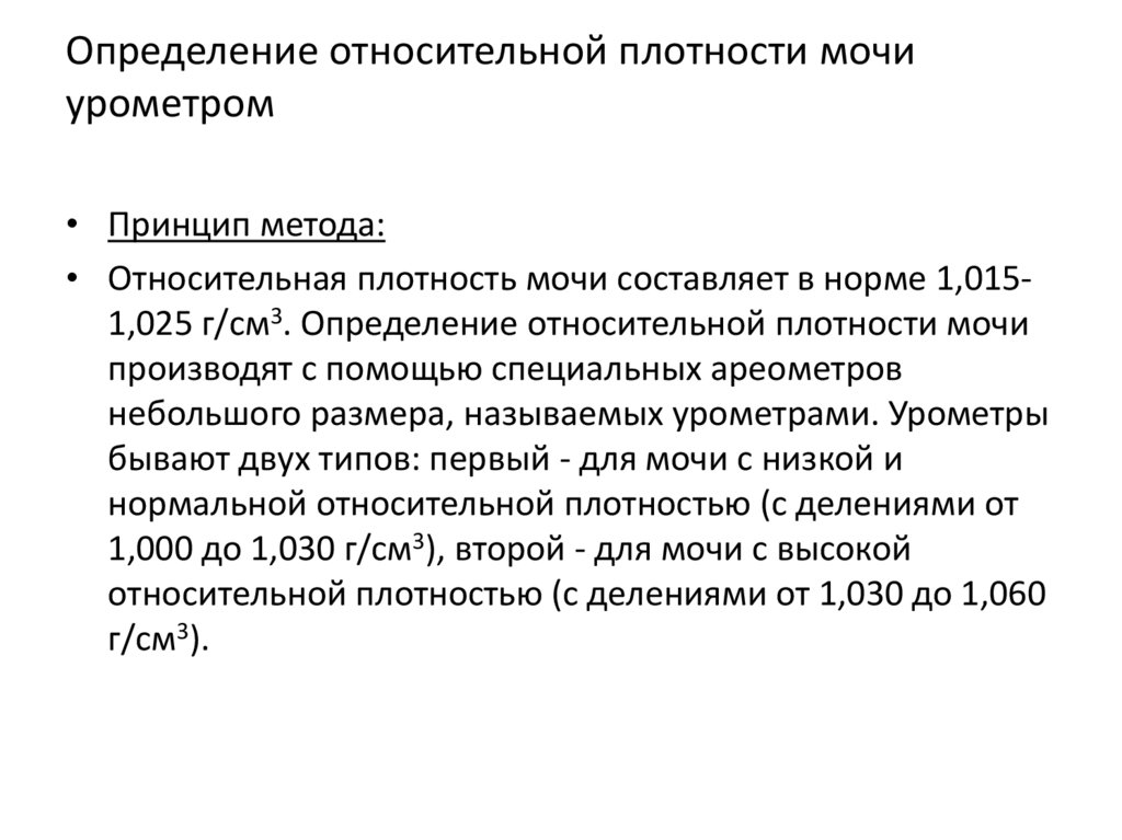 • Относительная плотность мочи составляет в норме 1,0151,025 г/см3. Определение относительной плотности мочи