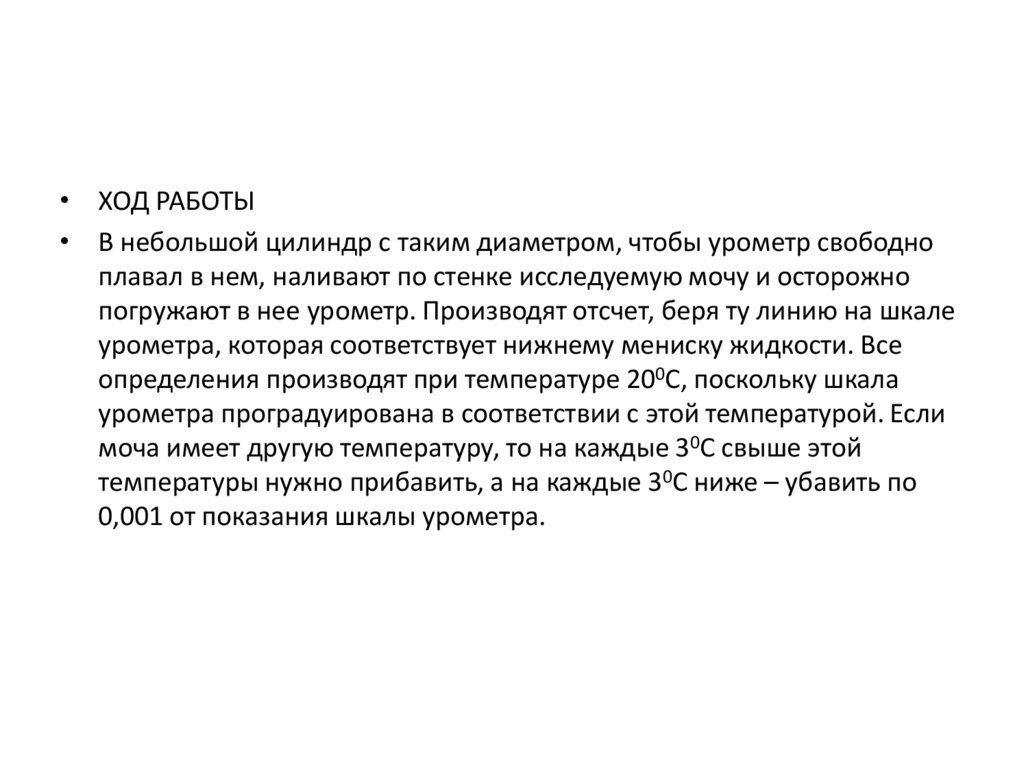 • ХОД РАБОТЫ• В небольшой цилиндр с таким диаметром, чтобы урометр свободно