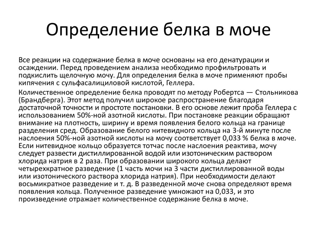Количественное определение белка проводят по методу Робертса — Стольникова
