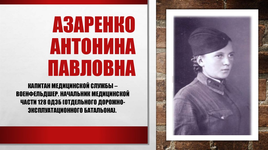 Капитан медицинской службы – военфельдшер Азаренко Антонина Павловна