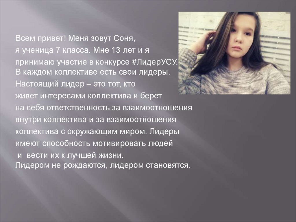 Всем привет! Меня зовут Соня,я ученица 7 класса. Мне 13 лет и я
