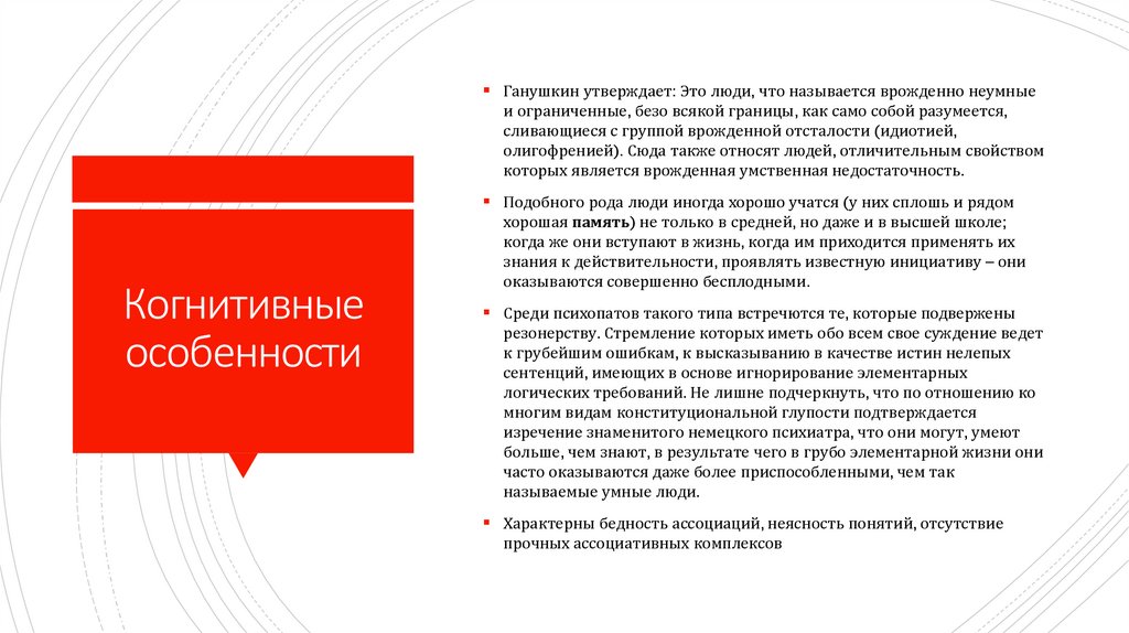 Ганушкин утверждает: Это люди, что называется врожденно неумныеи ограниченные, безо всякой границы, как само собой разумеется,