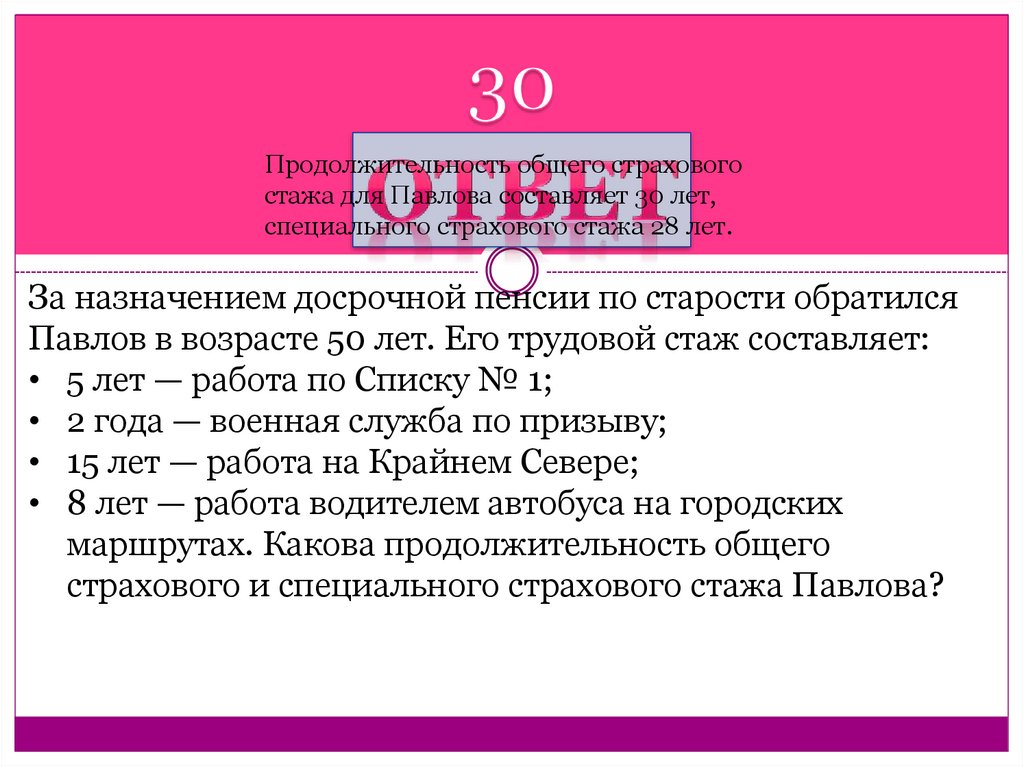 Продолжительность общего страховогостажа для Павлова составляет 30 лет,