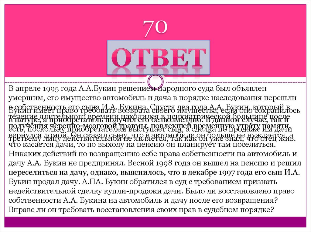 В апреле 1995 года А.А.Букин решением народного суда был объявленумершим, его имущество автомобиль и дача в порядке наследования перешли