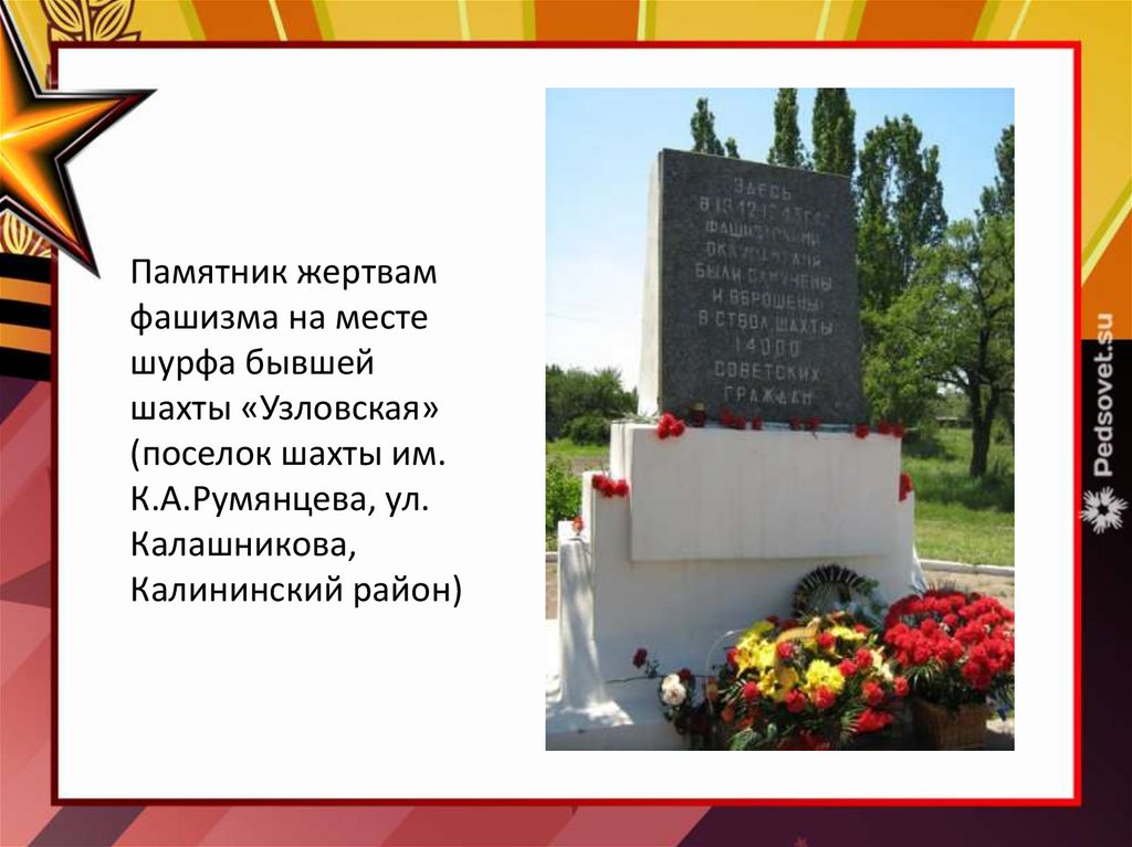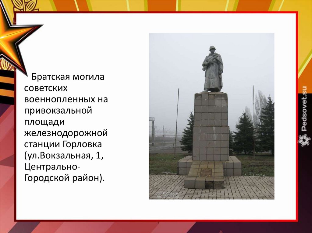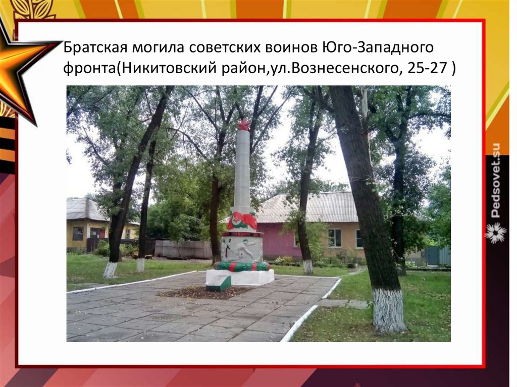 Братская могила советских воинов Юго-Западногофронта(Никитовский район,ул.Вознесенского, 25-27 )