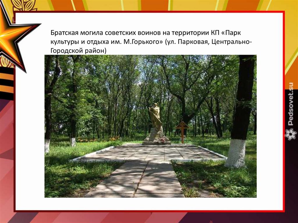 Братская могила советских воинов на территории КП «Парккультуры и отдыха им. М.Горького» (ул. Парковая, ЦентральноГородской район)